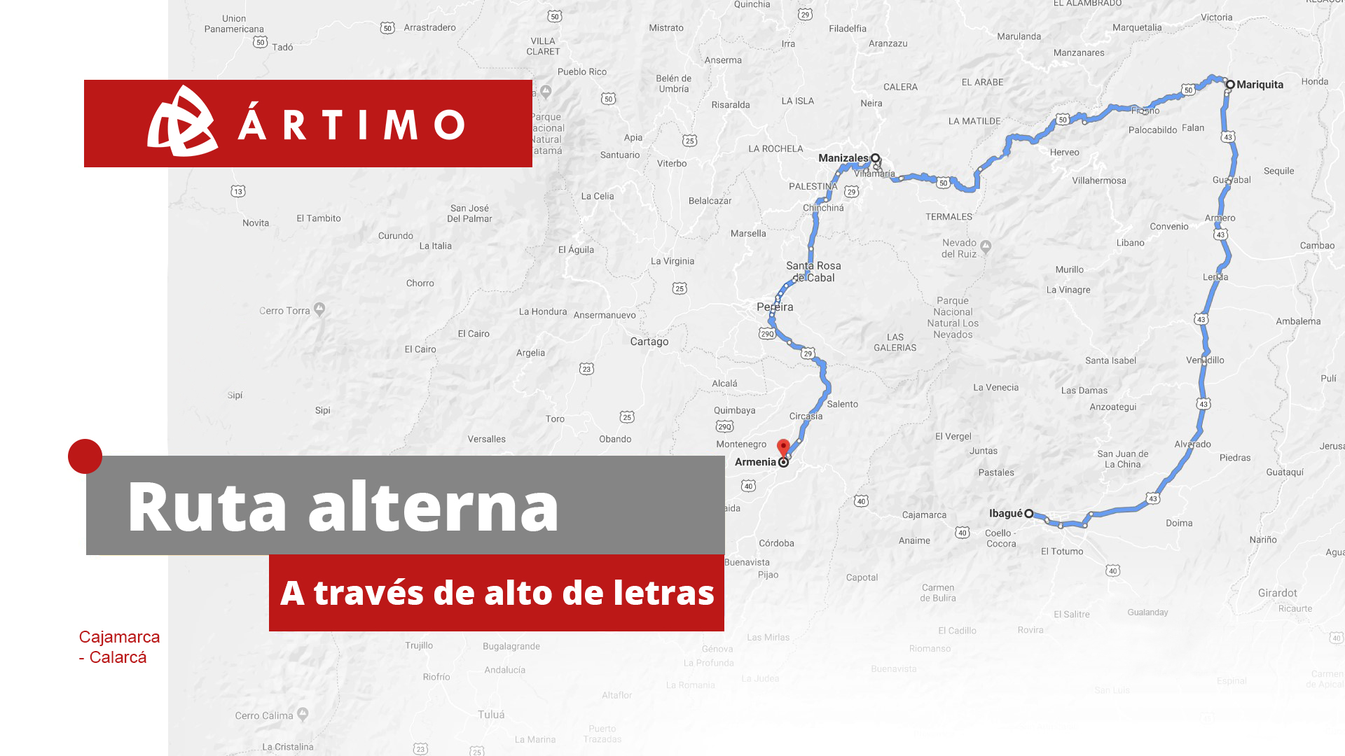 Para contribuir con la movilidad de los usuarios que se desplacen desde Ibagué, en el valle del río Magdalena y hasta Armenia, en el valle del río Cauca, la ruta alterna será a través de la vía Manizales (Alto de Letras)